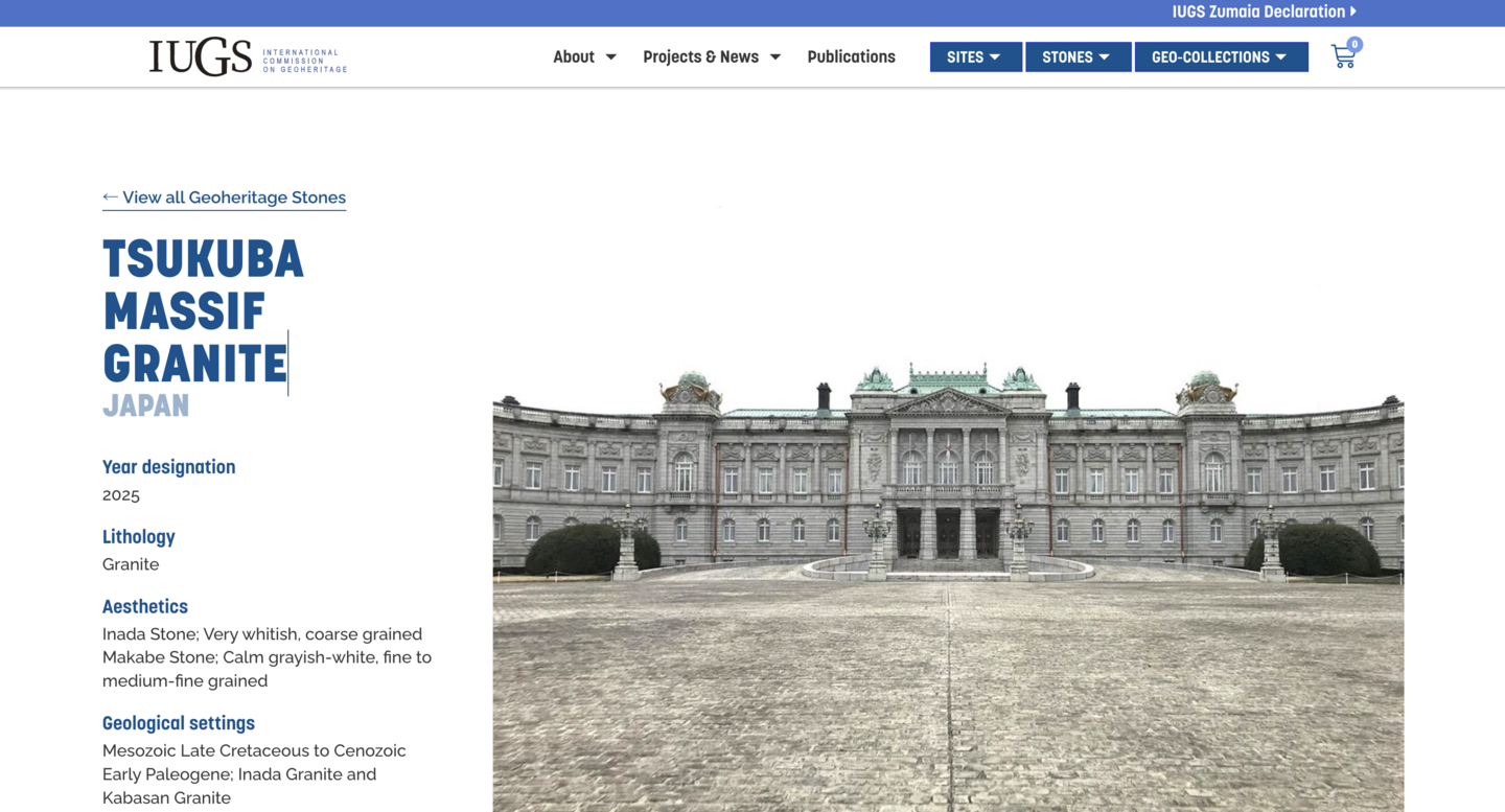 IUGS ヘリテージストーンのページはこちらです(https://iugs-geoheritage.org/geoheritage_stones/tsukuba-massif-granite/)。