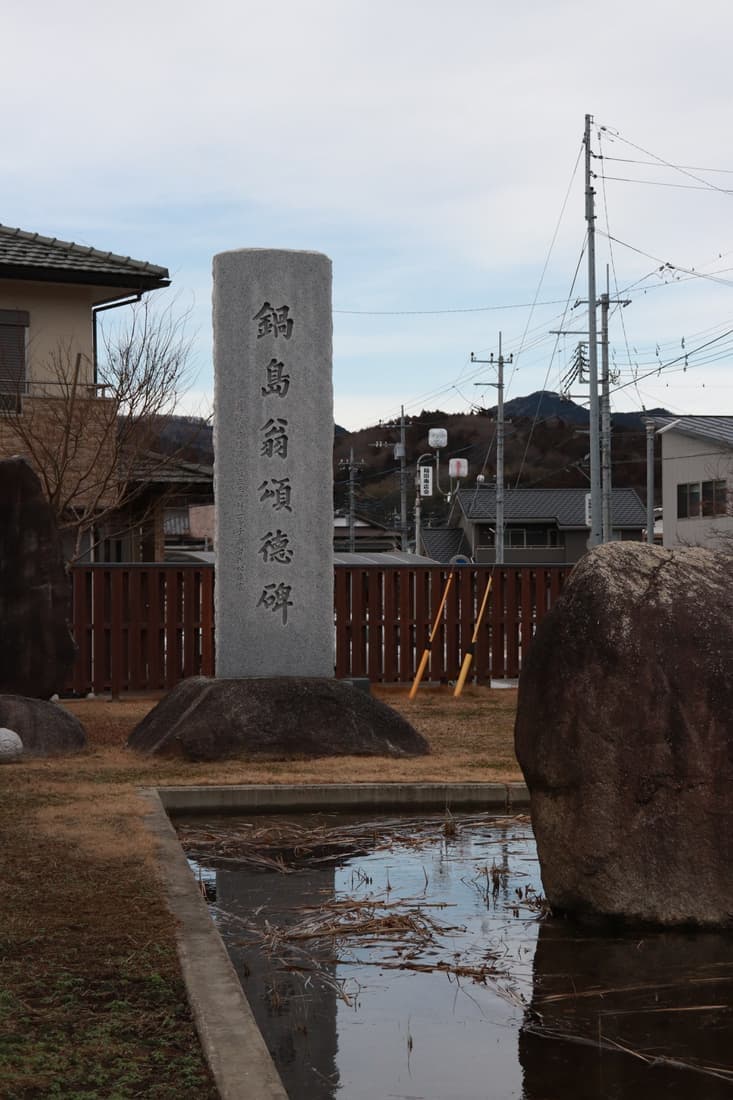 今でも稲田駅前に「鍋島翁頌徳碑」がある。これは明治39年に建立されたものだが、その中に「鍋島翁は備後(今の広島県)の人で少壮の時より石匠となり、明治29年稲田に来り、その地の花崗岩の石材、石質良好甚だ有望なることを思い、現地の有力者塙豊樹、武藤藤兵衞、笹目宗兵衛等と謀って採石にとりかかったところ、稲田花崗岩の名声はい よいよ顕著となり日本鉄道会社に対し、稲田停車場貨物駅を開設するに至った」 と記されている。彼は備後の国、吉田家の二男として誕生、少年の頃、郷里の呉服問屋へ奉行にでたが婦人相手の商売にはあきたらずそこをやめ、上京した。