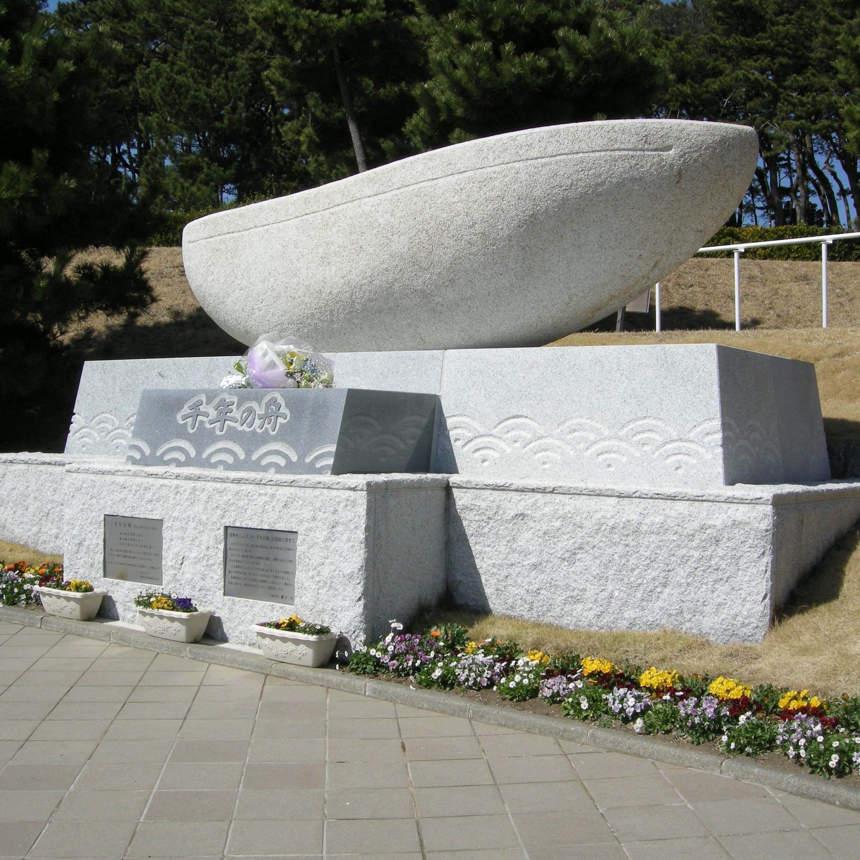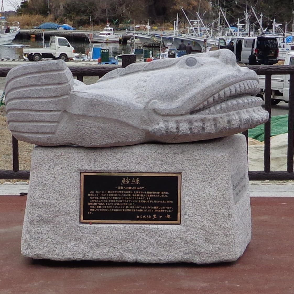 大洗水族館に設置されたモニュメントです。このモニュメントは単に石工が製作しただけではなく、「いばらきストーンフェスティバル」会場内で来場された皆様の手で製作された共同作品となります。老若男女みなさんが、石頭(せっとう)とノミを取り、模様を作っていただきました。