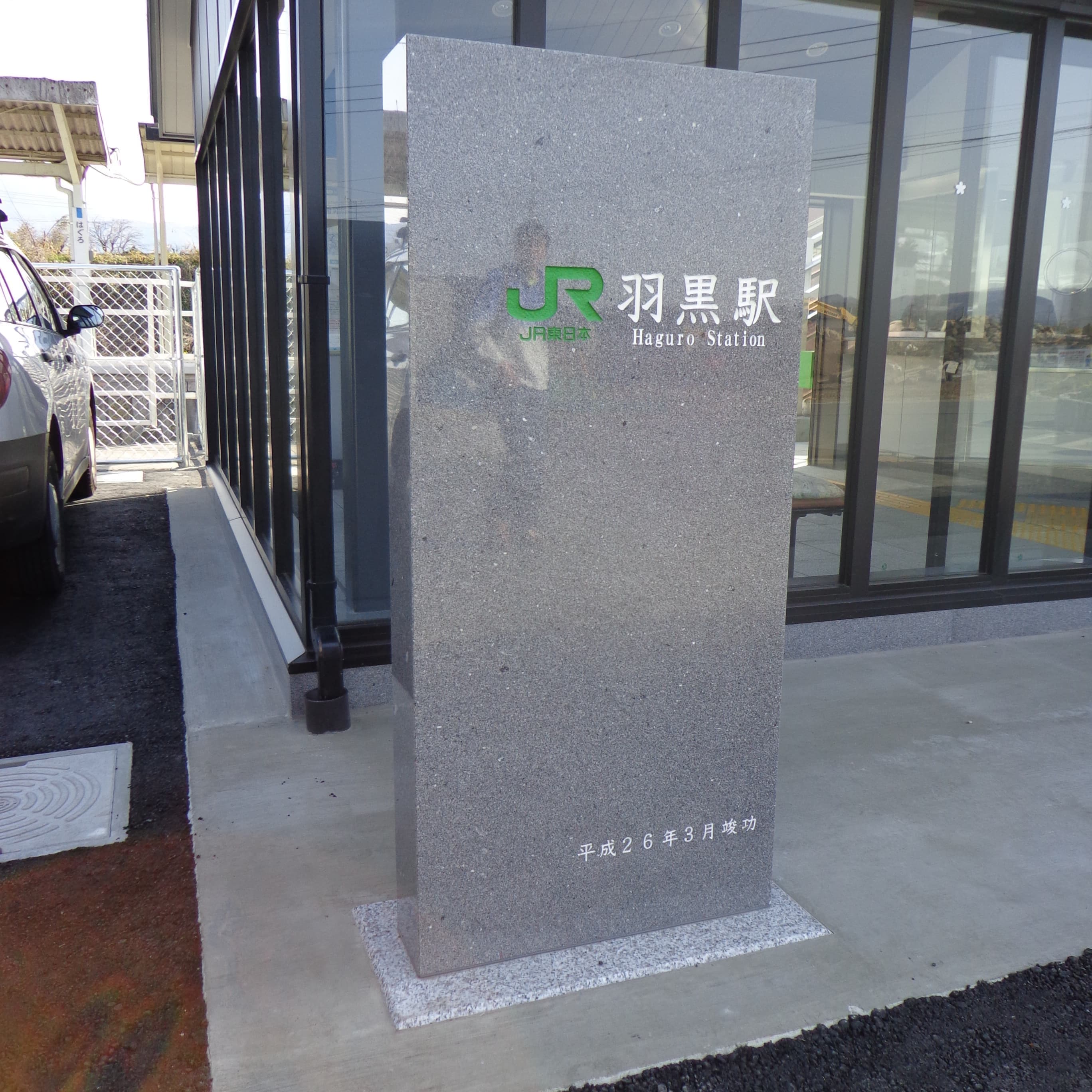 JR東日本水戸線羽黒駅舎の改修工事に伴い、地元産出の御影石を多量に使用していただきました。駅名看板はもちろん、カウンターや巾木にも羽黒青糠目石を使っていただくなど、地元の特徴を表した駅舎となりました