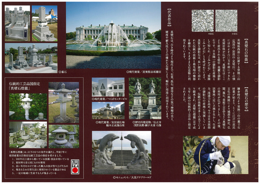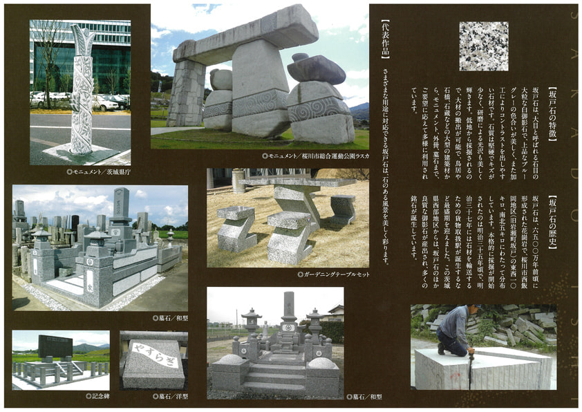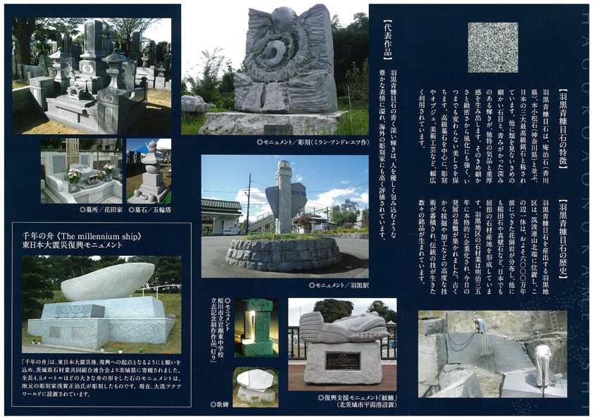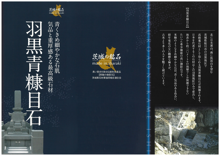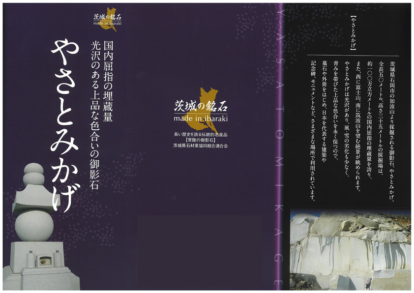 Granite 茨城で産出される御影石 ,http://gdata.youtube.com/feeds/api/videos/_fp6wJsLb5g,,{"playerWidth":"720","useCustom":true,"autoPlay":false,"autoLoop":false,"autoNext":false,"quality":"default","qualityName":"自動","coverImage":""} 羽黒青糠目石 「米糠のように細かな」から名づけられた通り、他に類を見ない石目の「細かさ」が特徴です。 均一な石目と青みがかった落ち着いた色合いは、糠目石独自の気品と重厚さを醸し出しています。 また、鉄気分の流出や変色がなく、いつまでも安心してお使い頂ける最上級の御影石です。 産出条件が厳しい事に加え、採掘された糠目石から墓石材として製品化するにあたり、厳選に厳選を加えた特級品となり、これは採掘量の5%程しかなく大変希少価値の高い石です。また彫刻材としても大変高い評価をいただいております。 見掛比重:2.706t/ 吸水率:0.23% 圧縮強度:126.21N/ ,http://gdata.youtube.com/feeds/api/videos/718lEe9Krpg,,{"playerWidth":"720","useCustom":true,"autoPlay":false,"autoLoop":false,"autoNext":false,"quality":"default","qualityName":"自動","coverImage":""} 稲田石 別名「白みかげ石」とも呼ばれ、日本一の採石量を誇ります。硬質で耐久性に優れ、特に大きな材料が採れるのが特徴です。稲田石は、大きくわけて、石英(ガラス光沢、透明度が良く、結晶がはっきりしたもの=水晶)長石(白)黒雲母(黒)の鉱物からなり、稲田石は、この長石の割合が多いので、他の花崗岩と比べても、純白に近い色になるのです。同時に石英の割合も多いため、硬質であるともいえます。使用先として墓石、土木用材、建築材など、あらゆる分野に幅広く使用されている。 見掛比重:2.63t/ 吸水率:0.220% 圧縮強度:167.480N/ ,http://gdata.youtube.com/feeds/api/videos/FFYM44qB2xY,,{"playerWidth":"720","useCustom":true,"autoPlay":false,"autoLoop":false,"autoNext":false,"quality":"default","qualityName":"自動","coverImage":""} 坂戸石 坂戸石は、 6500万年前頃に形成された花崗岩で、桜川市西飯岡地区(旧岩瀬町坂戸)の東西10キロ、南北5キロにわたって分布しています。本格的に採掘が開始されたのは明治35年頃で、明治37年には石材を輸送するための貨物取扱駅が誕生するなど最盛期を迎えました。石質は硬く、外柵、土木用材、モニュメントの素材などに多く使用されてます。この茨城県西部地区からは、坂戸石のほか良質な御影石が産出され、多くの銘石が誕生しています。 見掛比重:2.678t/ 吸水率:0.181% 圧縮強度:117.490N/ ,http://gdata.youtube.com/feeds/api/videos/32rw1sCQ3lo,,{"playerWidth":"720","useCustom":true,"autoPlay":false,"autoLoop":false,"autoNext":false,"quality":"default","qualityName":"自動","coverImage":""} やさとみかげ石 淡い青みをおぴた色合いで、石質は適度な硬度のため加工しやすく、墓石、モニュメントなどに多く使用されています。歴史的にも、古くは500年以上前から使用され、光沢があり、風雪の劣化が少なく、上品な材料です。その表情は「白御影石(みかげ石)」で、やさしい色目が特徴です。 そのため墓石材はもちろん、美術工芸、庭園装飾、建築土木など様々な分野で利用されます。石岡市(旧・八郷町)の加波山で採掘されてます。 見掛比重:2.659t/ 吸水率:0.2% 圧縮強度:161.32N/ 真壁小目石 茨城県西部に位置する常陸三山(筑波山・加波山・足尾山)には花崗岩体が広がり、真壁石はここから産出されます。別名、「こみかげ石」、「常陸こみかげ石」とも呼ばれてました。 石英、カリ長石、黒雲母などで生成され、その含有量と結晶の細かさの違いにより同じ真壁石でも色合いなどに違いがでることもあります。 見掛比重:2.638t/ 吸水率:0.233% 圧縮強度:120.000N/