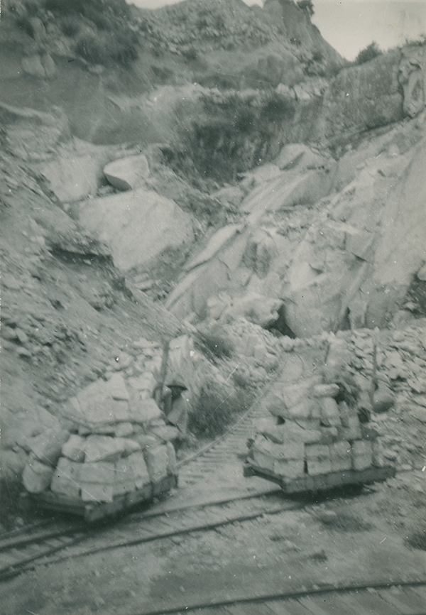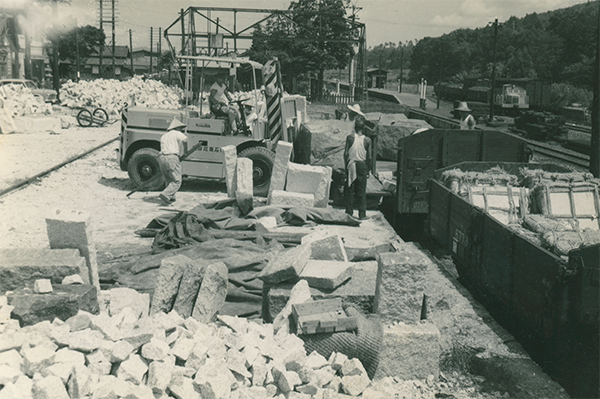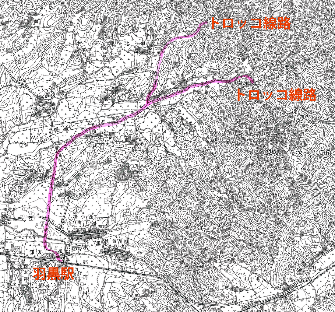 大貫亀夫の父亀吉、関東石材の株を買い取った山田藤次郎、これにつかえた大山商店の先祖によって切りひらかれ、池亀、松田、友部の山から発掘されたされた石材は馬車やトロッコで羽黒駅に集められ、建築材として東京へ貨車で積み出された。磯部を通ったトロッコはいわば新幹線であり、もとのトロッコは大月から小野池、下町を通って駅前へきたわけである。羽黒駅はそのために出来た貨物駅である」と。