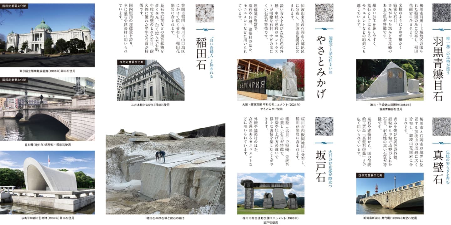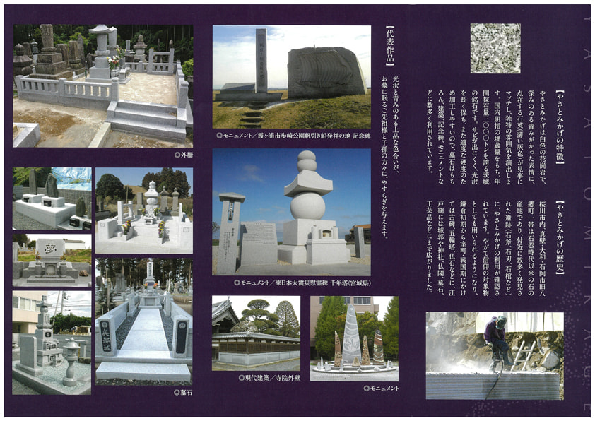 Granite 茨城で産出される御影石 ,http://gdata.youtube.com/feeds/api/videos/_fp6wJsLb5g,,{"playerWidth":"720","useCustom":true,"autoPlay":false,"autoLoop":false,"autoNext":false,"quality":"default","qualityName":"自動","coverImage":""} 羽黒青糠目石 「米糠のように細かな」から名づけられた通り、他に類を見ない石目の「細かさ」が特徴です。 均一な石目と青みがかった落ち着いた色合いは、糠目石独自の気品と重厚さを醸し出しています。 また、鉄気分の流出や変色がなく、いつまでも安心してお使い頂ける最上級の御影石です。 産出条件が厳しい事に加え、採掘された糠目石から墓石材として製品化するにあたり、厳選に厳選を加えた特級品となり、これは採掘量の5%程しかなく大変希少価値の高い石です。また彫刻材としても大変高い評価をいただいております。 見掛比重:2.706t/ 吸水率:0.23% 圧縮強度:126.21N/ ,http://gdata.youtube.com/feeds/api/videos/718lEe9Krpg,,{"playerWidth":"720","useCustom":true,"autoPlay":false,"autoLoop":false,"autoNext":false,"quality":"default","qualityName":"自動","coverImage":""} 稲田石 別名「白みかげ石」とも呼ばれ、日本一の採石量を誇ります。硬質で耐久性に優れ、特に大きな材料が採れるのが特徴です。稲田石は、大きくわけて、石英(ガラス光沢、透明度が良く、結晶がはっきりしたもの=水晶)長石(白)黒雲母(黒)の鉱物からなり、稲田石は、この長石の割合が多いので、他の花崗岩と比べても、純白に近い色になるのです。同時に石英の割合も多いため、硬質であるともいえます。使用先として墓石、土木用材、建築材など、あらゆる分野に幅広く使用されている。 見掛比重:2.63t/ 吸水率:0.220% 圧縮強度:167.480N/ ,http://gdata.youtube.com/feeds/api/videos/FFYM44qB2xY,,{"playerWidth":"720","useCustom":true,"autoPlay":false,"autoLoop":false,"autoNext":false,"quality":"default","qualityName":"自動","coverImage":""} 坂戸石 坂戸石は、 6500万年前頃に形成された花崗岩で、桜川市西飯岡地区(旧岩瀬町坂戸)の東西10キロ、南北5キロにわたって分布しています。本格的に採掘が開始されたのは明治35年頃で、明治37年には石材を輸送するための貨物取扱駅が誕生するなど最盛期を迎えました。石質は硬く、外柵、土木用材、モニュメントの素材などに多く使用されてます。この茨城県西部地区からは、坂戸石のほか良質な御影石が産出され、多くの銘石が誕生しています。 見掛比重:2.678t/ 吸水率:0.181% 圧縮強度:117.490N/ ,http://gdata.youtube.com/feeds/api/videos/32rw1sCQ3lo,,{"playerWidth":"720","useCustom":true,"autoPlay":false,"autoLoop":false,"autoNext":false,"quality":"default","qualityName":"自動","coverImage":""} やさとみかげ石 淡い青みをおぴた色合いで、石質は適度な硬度のため加工しやすく、墓石、モニュメントなどに多く使用されています。歴史的にも、古くは500年以上前から使用され、光沢があり、風雪の劣化が少なく、上品な材料です。その表情は「白御影石(みかげ石)」で、やさしい色目が特徴です。 そのため墓石材はもちろん、美術工芸、庭園装飾、建築土木など様々な分野で利用されます。石岡市(旧・八郷町)の加波山で採掘されてます。 見掛比重:2.659t/ 吸水率:0.2% 圧縮強度:161.32N/ 真壁小目石 茨城県西部に位置する常陸三山(筑波山・加波山・足尾山)には花崗岩体が広がり、真壁石はここから産出されます。別名、「こみかげ石」、「常陸こみかげ石」とも呼ばれてました。 石英、カリ長石、黒雲母などで生成され、その含有量と結晶の細かさの違いにより同じ真壁石でも色合いなどに違いがでることもあります。 見掛比重:2.638t/ 吸水率:0.233% 圧縮強度:120.000N/